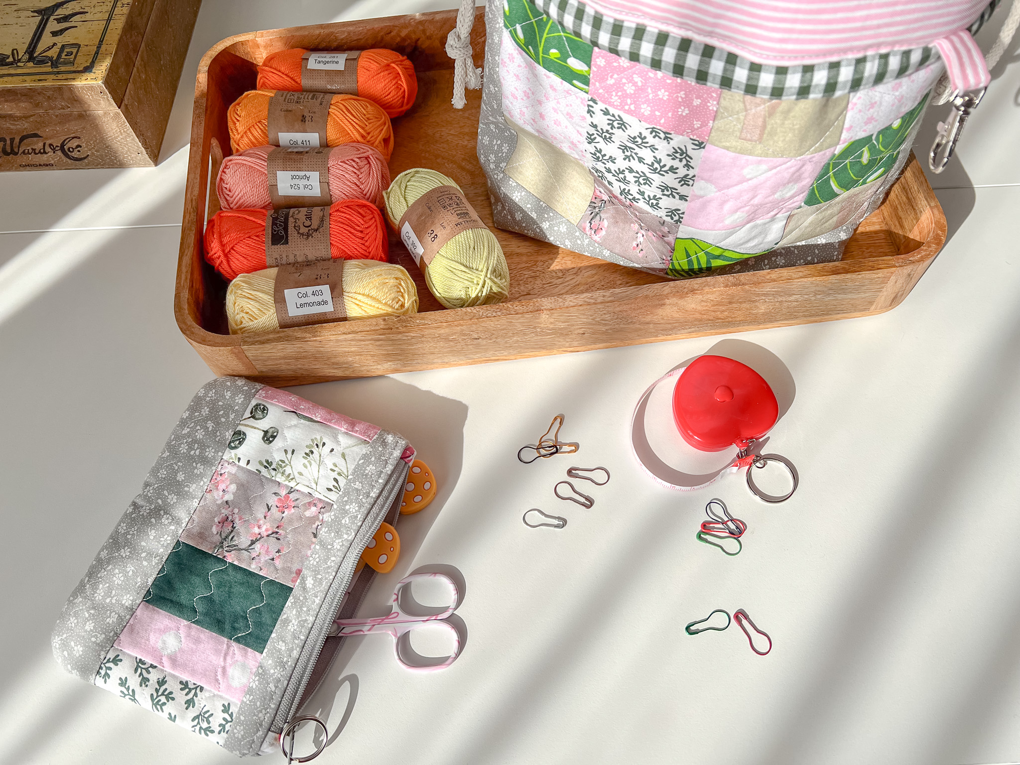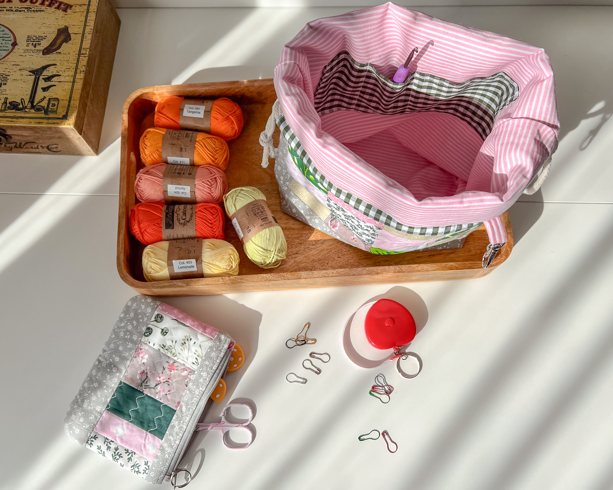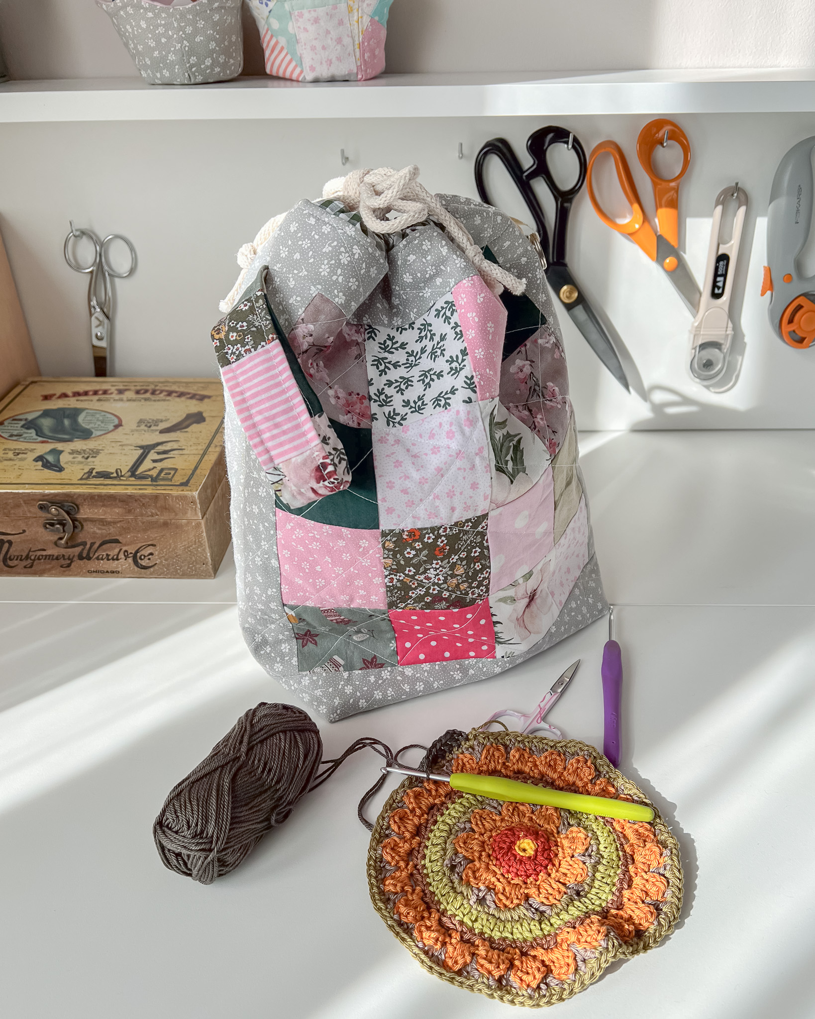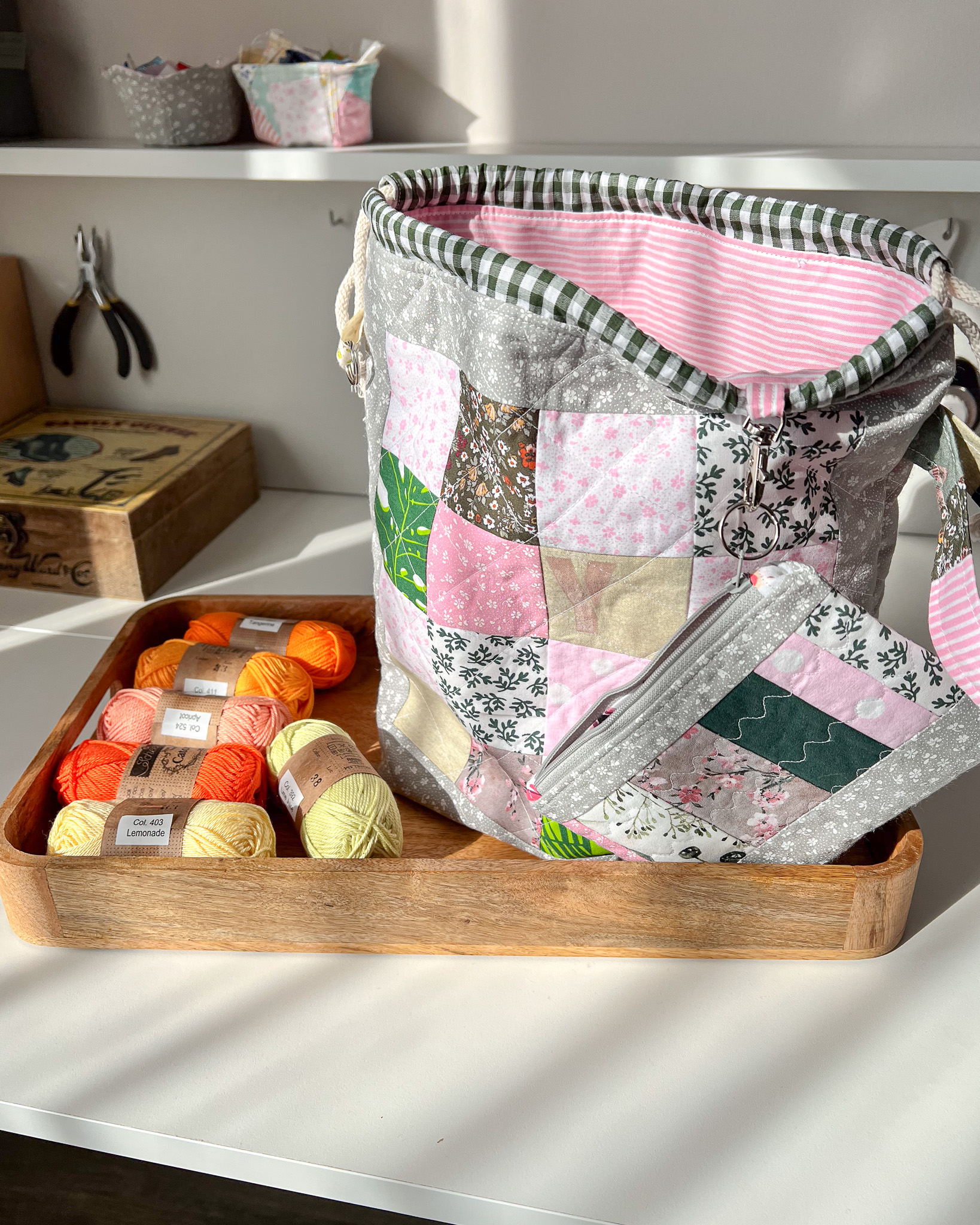 Ten woreczek idealnie przechowa wiosenne (oczywiście nie tylko) projekty dziergane, szydełkowe, czy ręcznie wyszywane. A do tego ma małą saszetkę w której można przechować różne akcesoria, np. nożyczki, markery, stopery do drutów, itp.